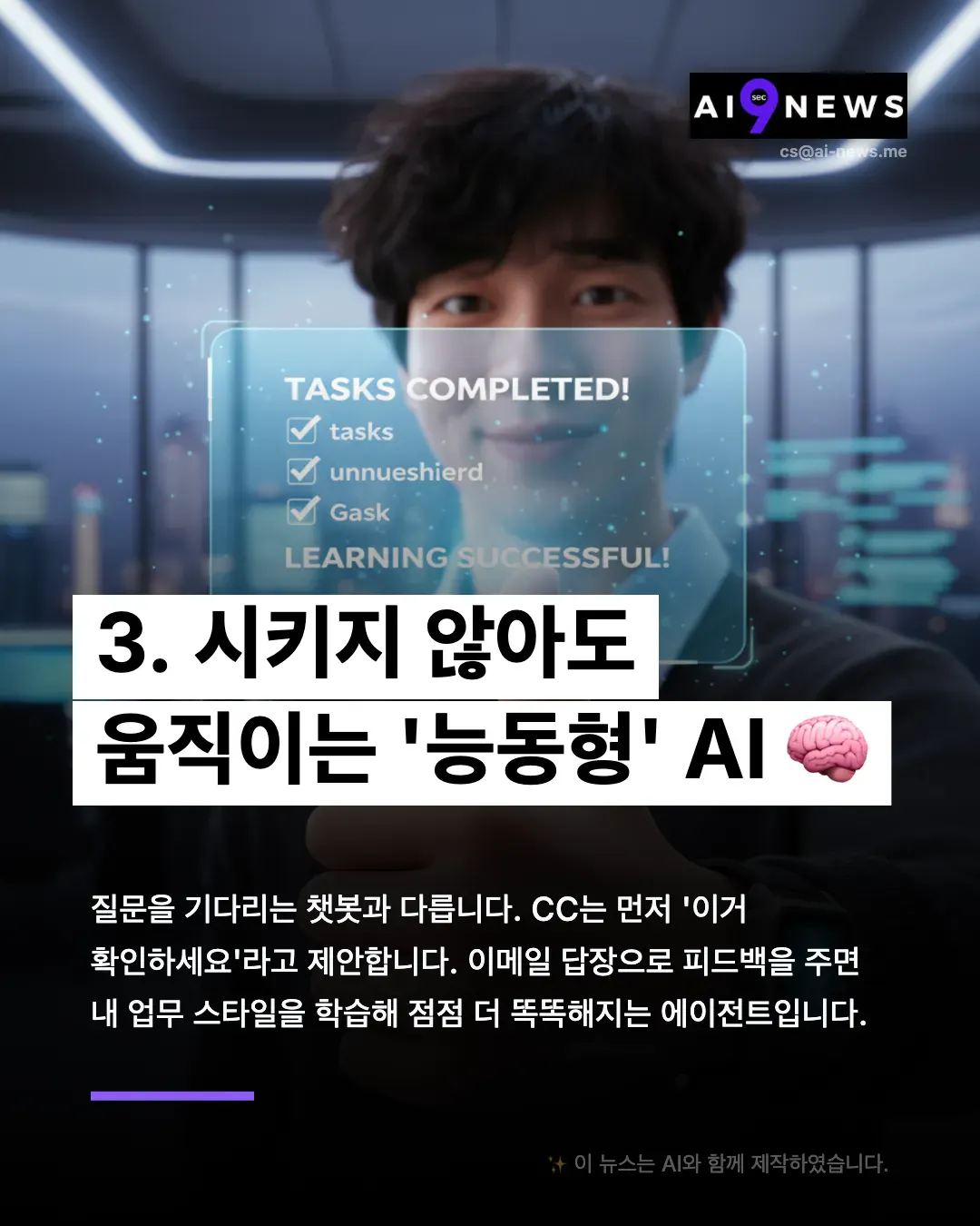 기존 챗봇들이 우리가 프롬프트를 줘야 움직이는 수동형이었다면, CC는 지메일 인박스에 상주하면서 먼저 'Your Day Ahead'를 브리핑해줍니다. ㄷㄷ