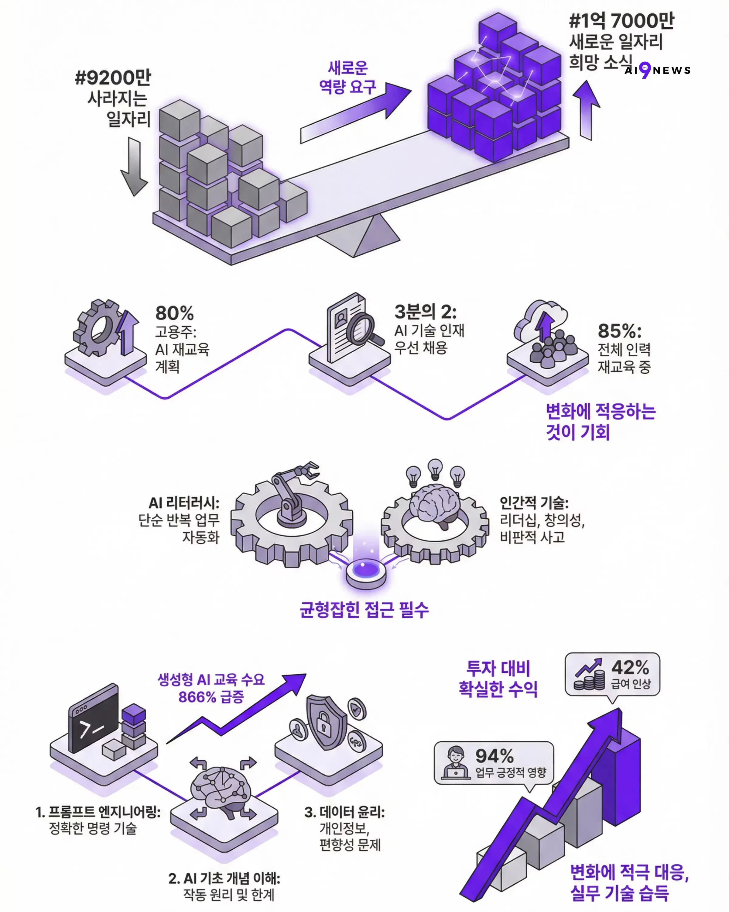 최근 'WEF 보고서'랑 '실제 채용 트렌드'를 보는데, 이게 진짜 장난이 아니네요. 기업 80%가 직원 재교육 들어가고, AI 쓸 줄 아는 사람을 무조건 1순위로 뽑겠답니다.