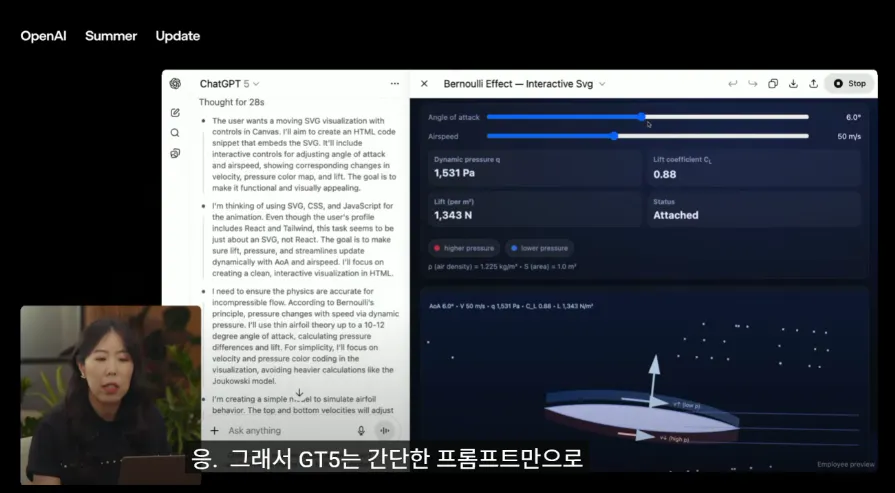 "비행기 날개 위쪽 공기 흐름이 빨라져서 양력이 생기는 베르누이 효과, 움직이는 애니메이션으로 만들어줘"라고 하자, GPT-5가 내부적으로 ‘오케이, 이건 물리 법칙을 시각화하는 거군.React랑 SVG 같은 도구를 써서 정확하게 구현해야겠다’고 계획을 세워.