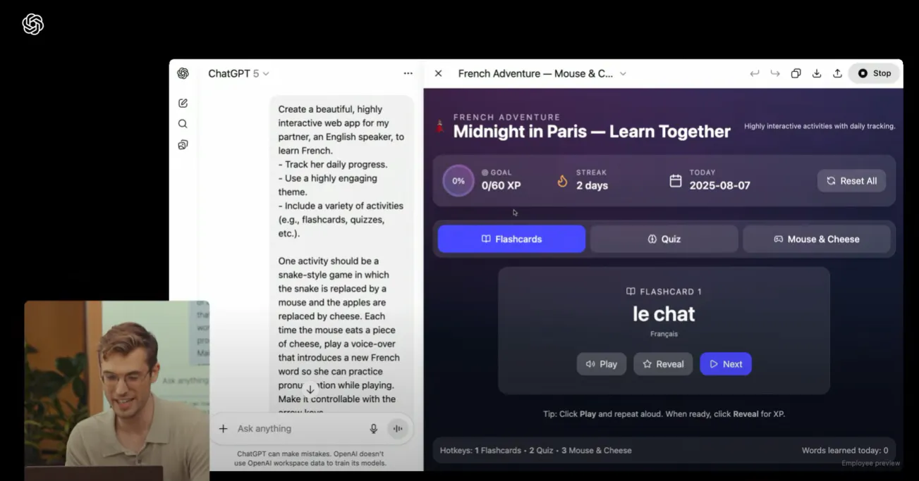 “내 파트너가 프랑스어 배우는데 쓸 만한 웹앱 좀 만들어줘”라는 단 한 문장을 던지자, 단어 암기용 플래시카드, 실력 테스트용 퀴즈, 심지어 ‘마우스와 치즈’라는 미니게임까지 포함된 학습 앱을 뚝딱 만들어내.