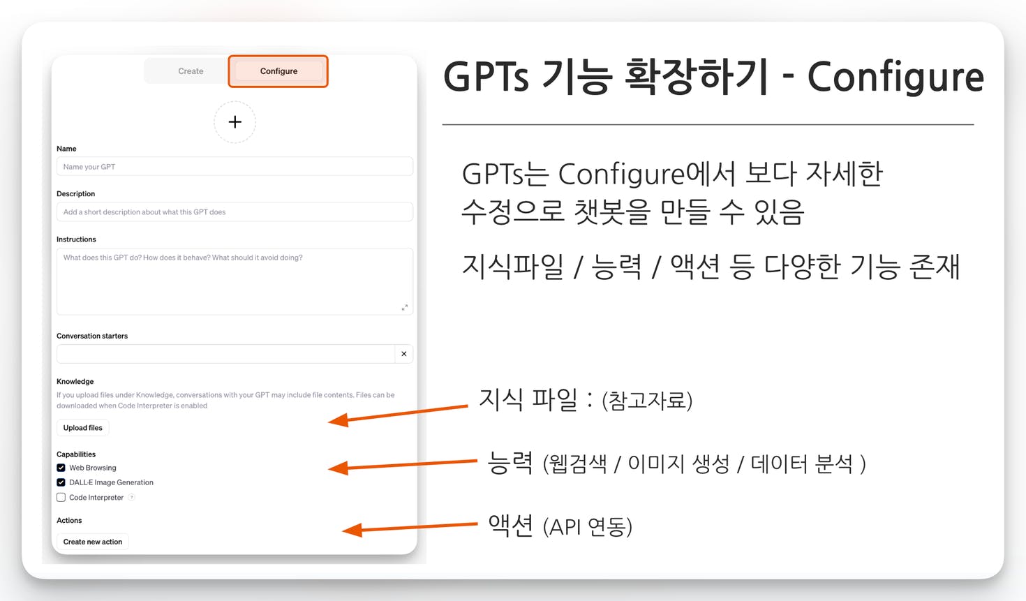 GPTs는 Configure에서 보다 자세한 수정으로 챗봇을 만들 수 있어요. 지식파일 / 능력 / 액션 등 다양한 기능이 존재해요.