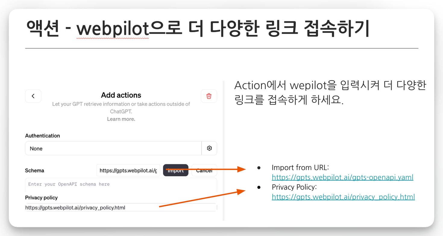 GPTs의 웹브라우징 기능으로는 원하는 링크에 접속하지 못했던 경험도 있으실 거예요. 이럴 떄는 Action을 이용하여 Webpilot을 설치하세요. 그럼 훨씬 더 다양한 링크에 접속할 수 있습니다.