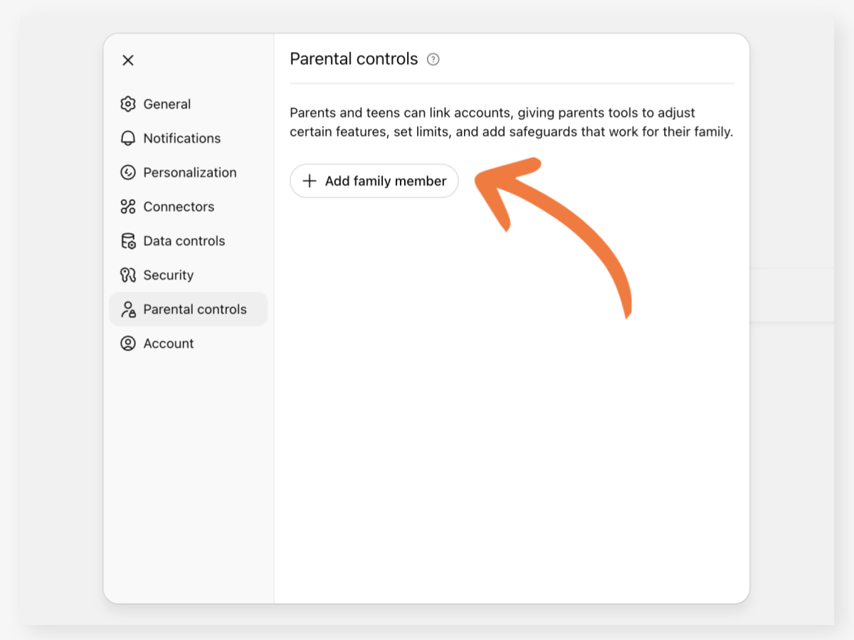 - ChatGPT > Settings > Parental controls에 접속해, Add family member를 클릭합니다.