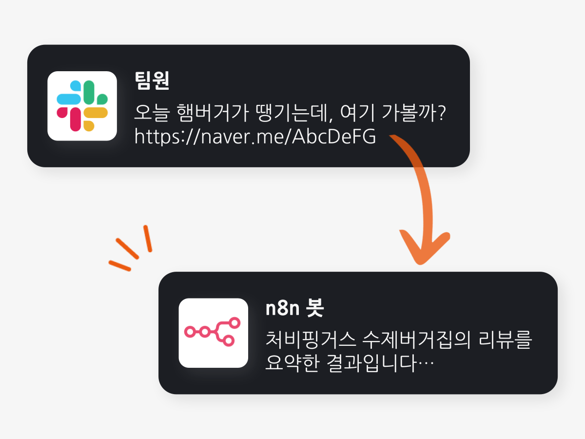 요약: 디디DD님은 회사 슬랙 채널에서 네이버 지도 url이 올라오면, 리뷰를 수합해 알려주는 슬랙봇을 n8n으로 만들었습니다.