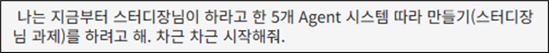 - 젠스파크에서 “나는 다음의 실전 예제를 차근 차근 단계별로 진행하고 싶어. 그래서 나의 사례를 만들고 싶어……..”로 프롬프트를 넣어 사례 만들기 시작함. Agents를 사용하라고 하셔서 Agnets를 사용하는 사례를 만들었고 싶다고 프롬프트를 썼음.