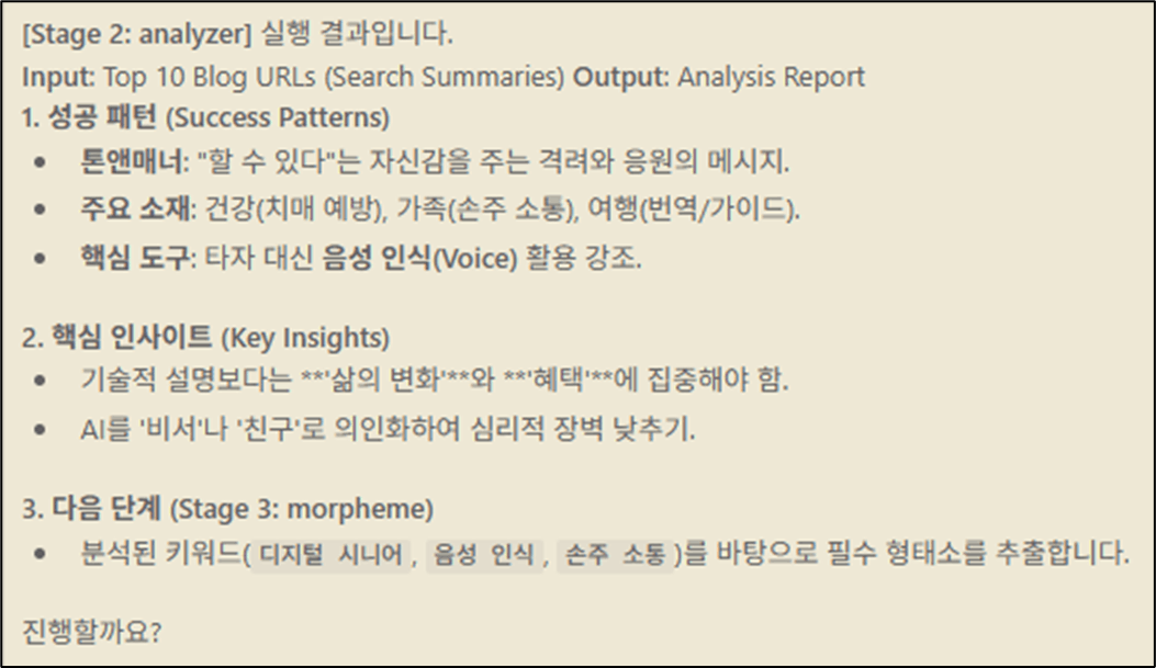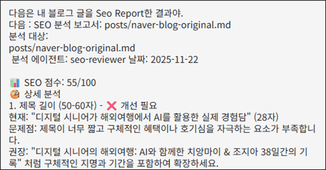 ⓑ 2번 내가 직접 내 블로그의 글에 대해 seo-reviewer 에이전트로 분석함. Antigravity 채팅창에 다음을 순서대로 입력했음.