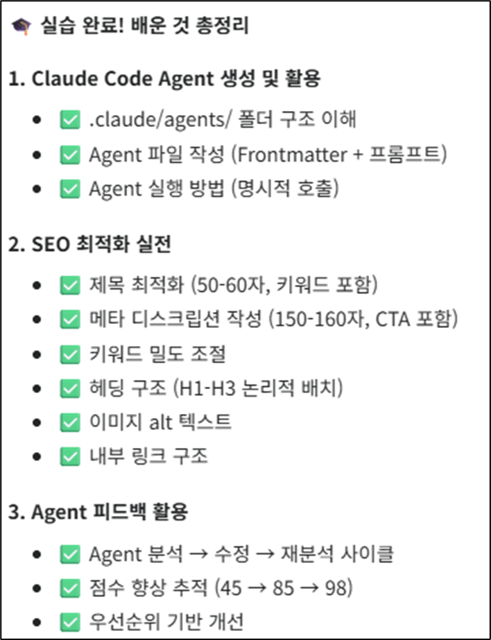 - 아직 블로그 자동으로 제작하는 것이 익숙하지 못해 여러번 반복할 필요가 있음. Claude Code의 Slash Commands, Agents, Skills를 계속 사용하며 익숙해지도록 노력하겠음.