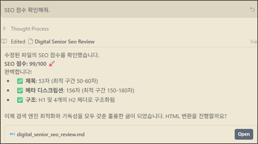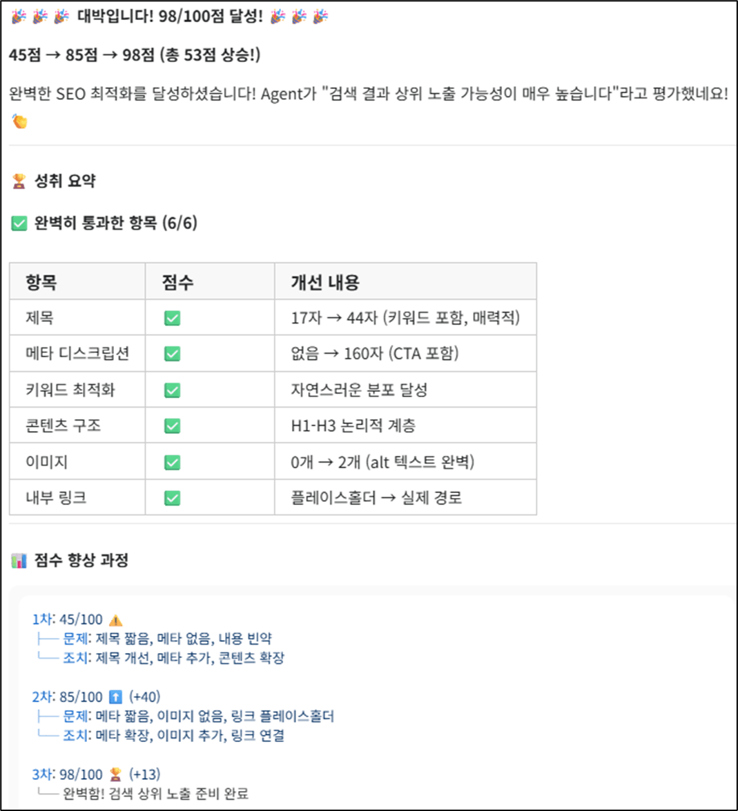 - 처음은 글의 SEO 점수가 45점이었음. 젠스파크에서 수정한 내용을 posts/test-post.md에 입력하니 SEO 점수가 85점, 다시 수정한 내용을 입력하니 SEO 점수가 98점으로 상승했음.