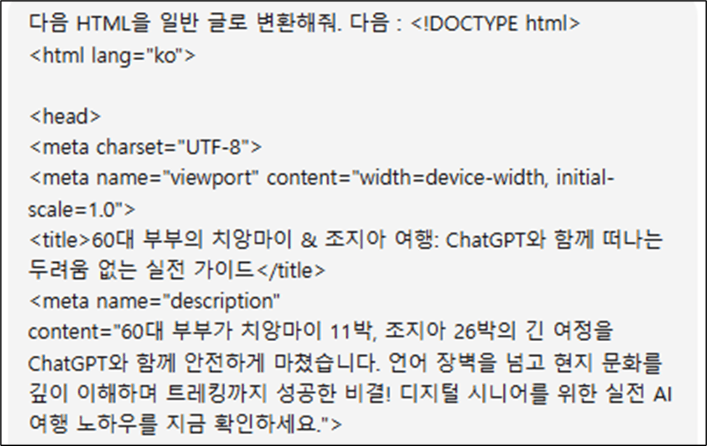 - HTML로 만들었으나 그것을 자연어로 바꾸는 방법을 몰라 ChatGPT에게 일반 글로 변환해달라고 해서 변환해서 블로그에 포스팅함.