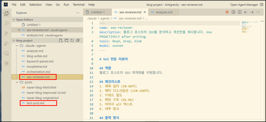 - Agent 실행하기 : 오른쪽 Antigravity 채팅창에 “seo-reviewer 에이전트로 posts/test-post.md