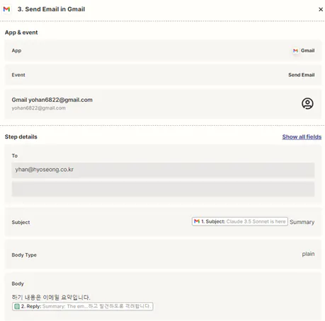 요약된 이메일을 다시 받고자 하는 이메일로 제목과 요약하는 방식을 설정합니다.