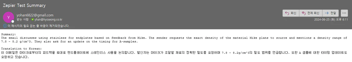 Action Setting : 신규 접수된 이메일을 ChatGPT를 통해 요약 및 번역 시키고 다시 보내는 걸로 Setting 하였습니다.
