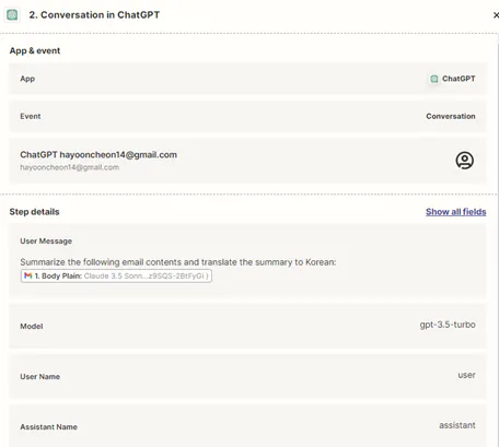 2. ChatGPT를 설정하고 Event는 Conversation으로 요구하는 바를 정확하게 수행해달라고 합니다. 모델 은 GPT-3.5 Turbo로 접수된 이메일의 본문을 요약하고 또 한국어로 번역을 할 수 있도록 저의 메시지를 설정합니다.