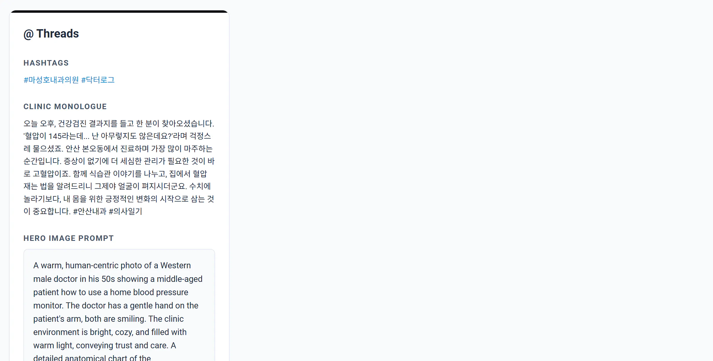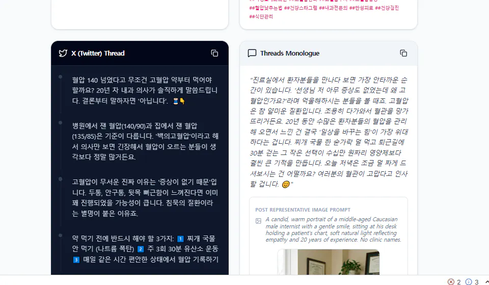 • AI 처방: 블로그 글(텍스트)을 넣으면 자동으로 스레드용 요약, X용 스레드 글, 인스타 카드뉴스 대본으로 변환해주는 '프롬프트 체인'이 필요해 보입니다.