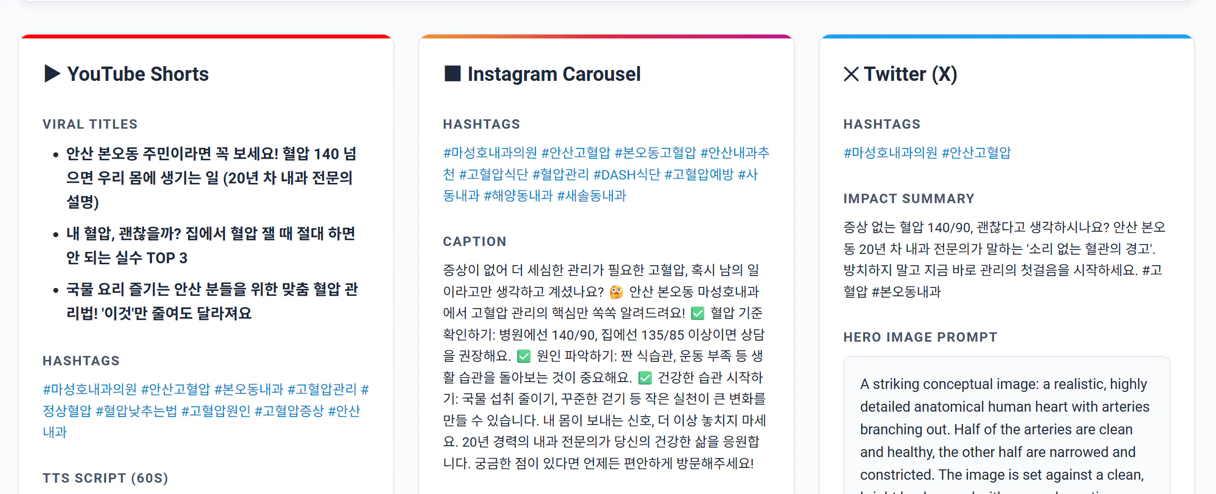 • Hyper-local Injection: Dynamically inject Ansan-based keywords (Bono-dong, Sa-dong, Saesol-dong) into 30% of titles, captions, and hashtags to attract local patients.