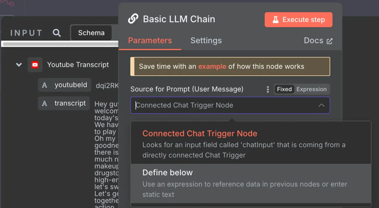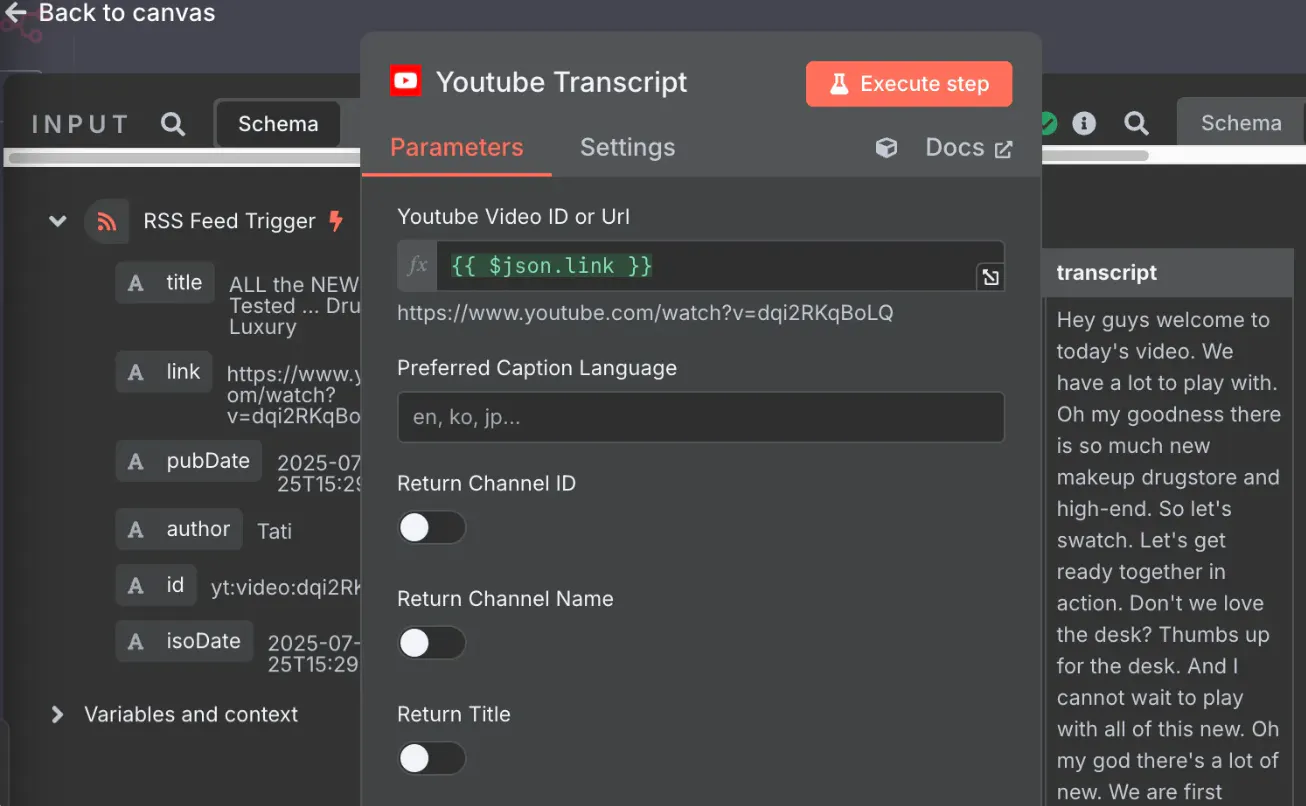 채널명 - Author, 영상제목 - Title, 요약 - Text / URL - Link —> Execute step