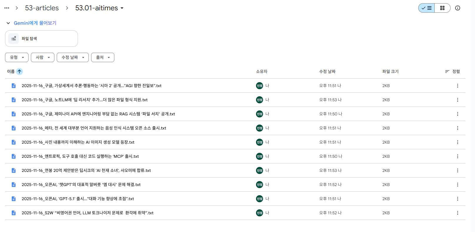 아래처럼 총 9개의 뉴스가 Google Drive에 자동 저장되었어요. 😃