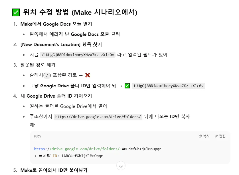 • 📂 Google Docs 모듈에서 자꾸 실패 → 알고 보니 드라이브 폴더 ID를 안 넣었음
