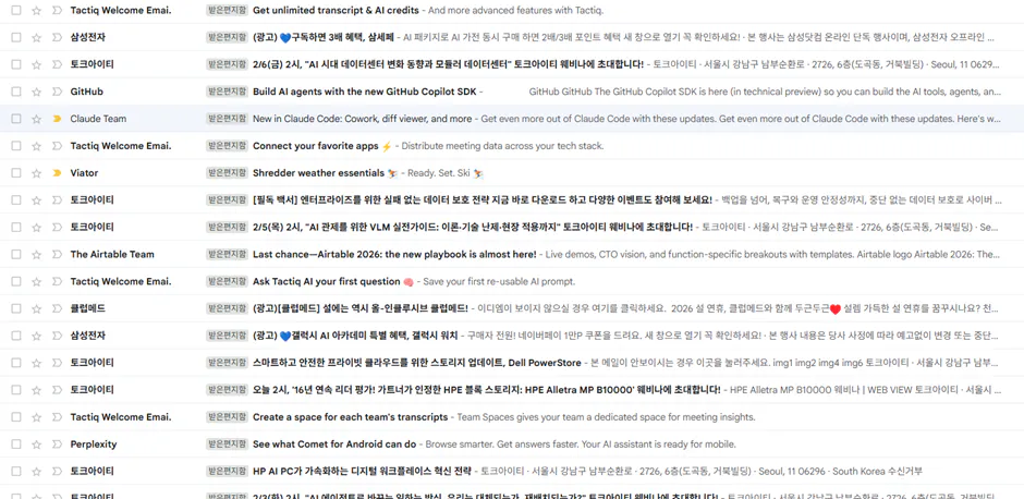 • 받은 메일에 (광고) 메일과 다양한 수신 메이 있으며, 휴지통은 빈 상태임.
