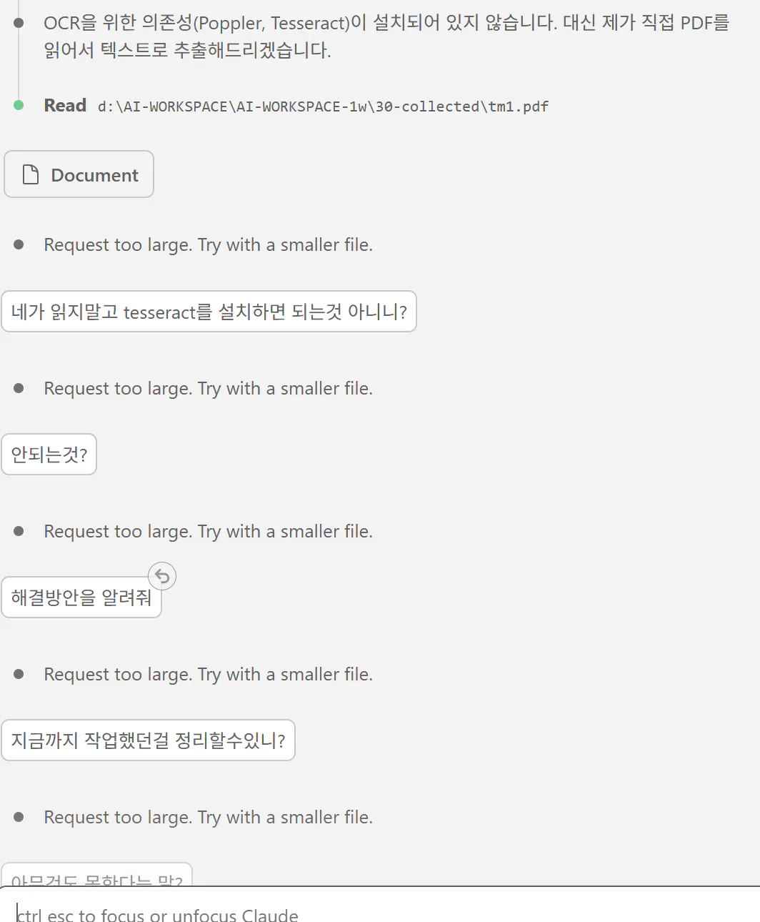 중간에 클로드코드에서 "Request too large. Try with a smaller file."라고 응답하며