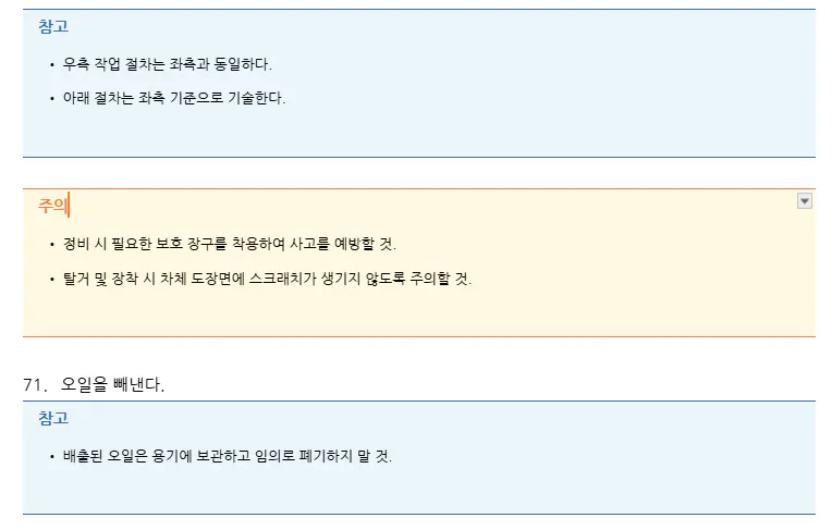 지침서는 구조가 매우 규칙적입니다. 탈거 → 분해 → 점검 → 조립 → 장착의 흐름, 경고/주의/참고 박스, 좌텍스트+우이미지 2열 레이아웃이 수백 페이지 반복됩니다. 이 구조를 스킬로 정의해두면 챕터 단위로 빠르게 완성본 docx를 뽑을 수 있겠다고 판단했습니다. 한 챕터(22페이지)를 수작업으로 하면 하루 이상 걸리지만, 자동화하면 한 세션 내에 완성할 수 있습니다.