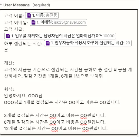 Zapier을 활용하여 고객에게 입력 받은 절감 시간과 시급을 계산합니다.