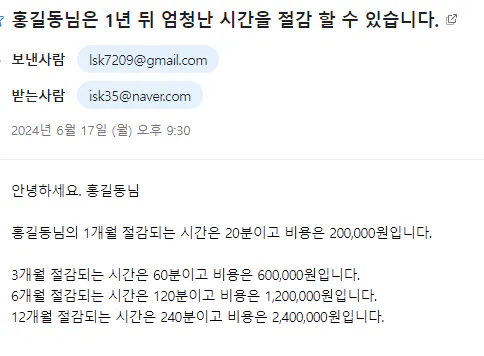 ex) 하루 10분 / 시급 15000원 = 7주일이면 17000원 절감 / 1개월은 3만원 / 1년이면 36만원 절감 효과