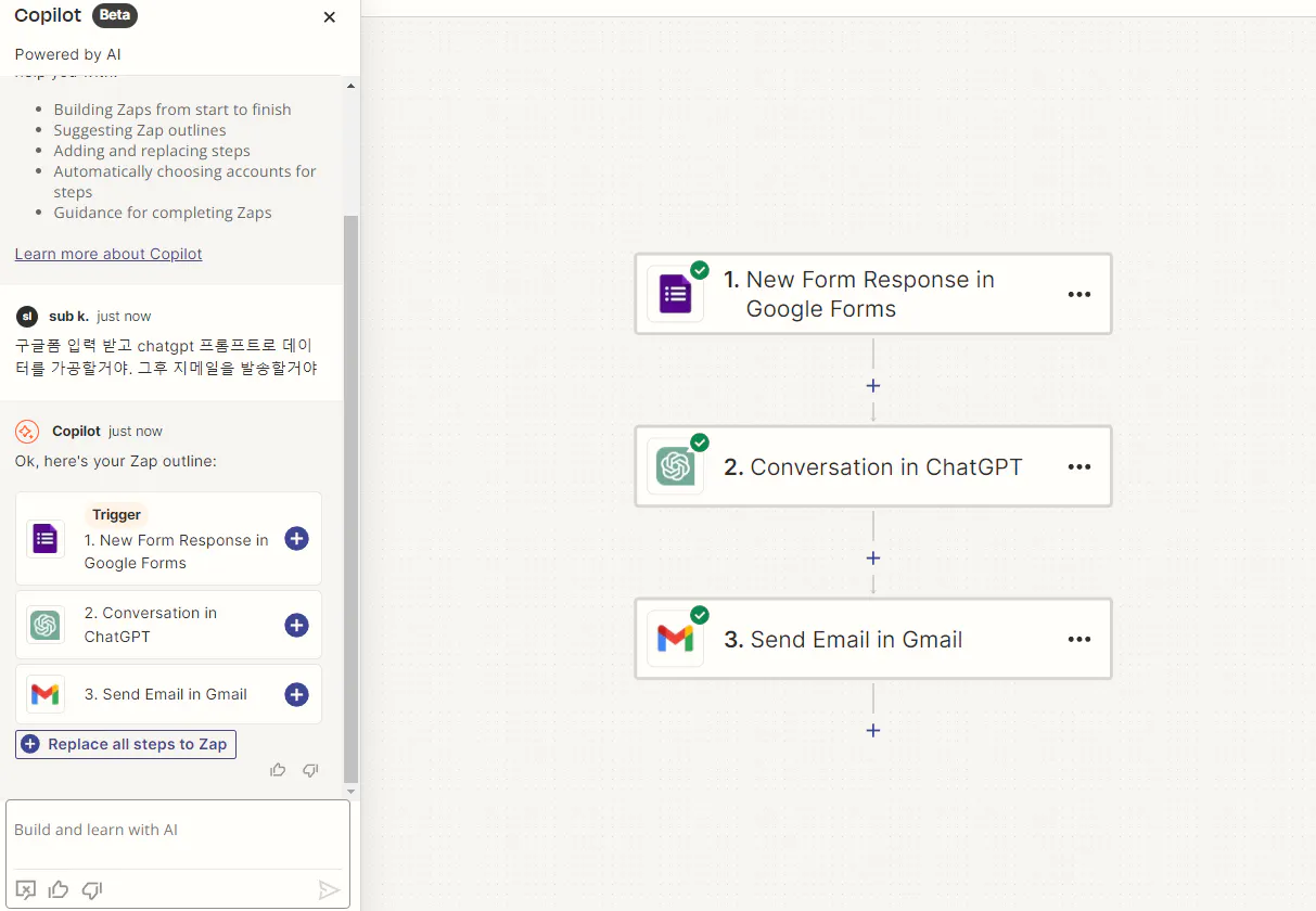 ==== zapier 접속해서 코파일럿의 도움을 받아 zapier 자동화를 구성 했습니다 ====