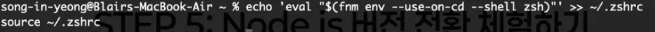 • 설치 후 터미널이 fnm을 자동으로 인식하도록 설정하는 단계