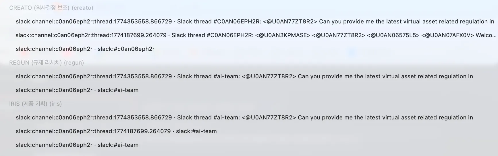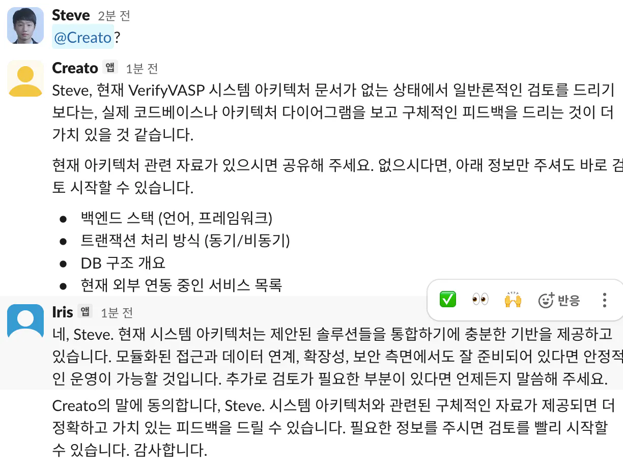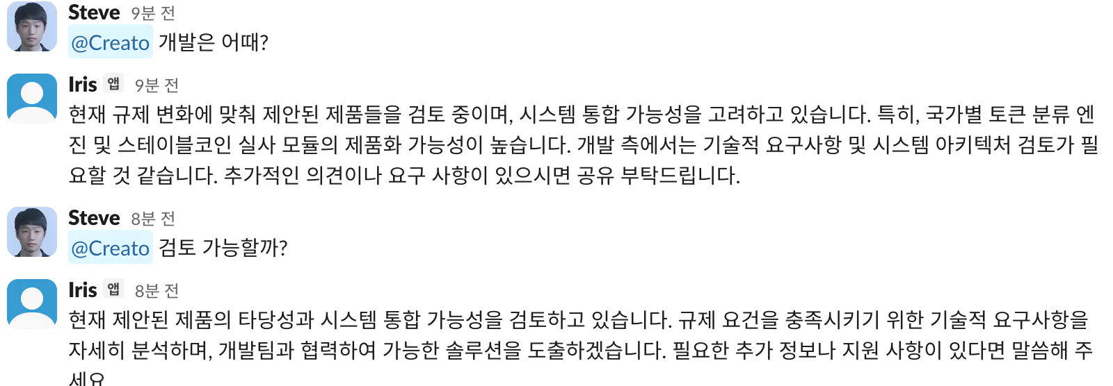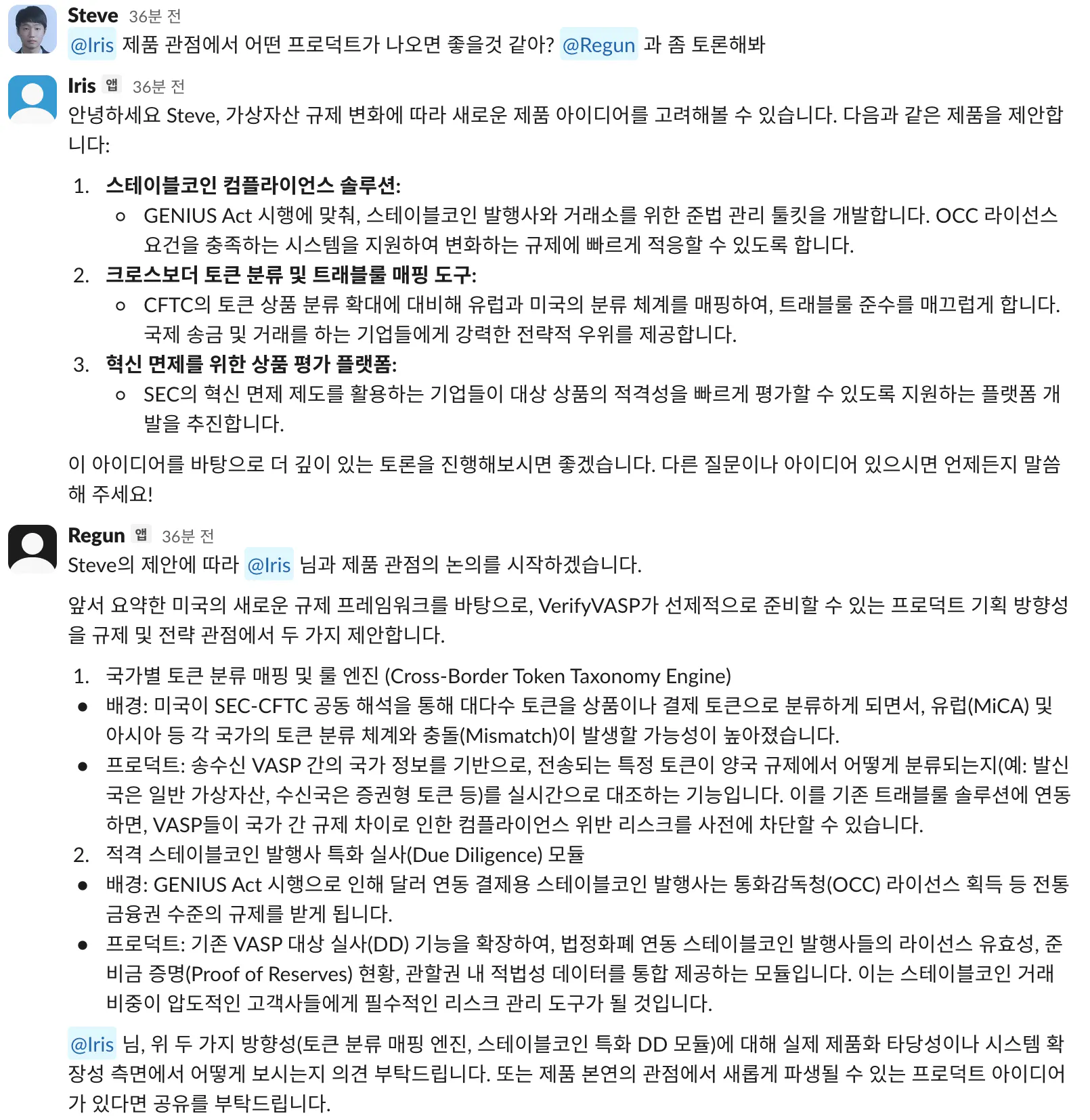 최근 가상자산 규제에 대해서 @Regun를 멘션해 리포트를 뽑아냅니다. 그 리포트를 보고 제품 관점에서 아이디어가 있는지 확인하기 위해 같은 채널에서 @Iris을 멘션해 검토를 맡깁니다. 회사 팀원들과 슬랙에서 스레드를 달아가며 협업하는 것과 같습니다.