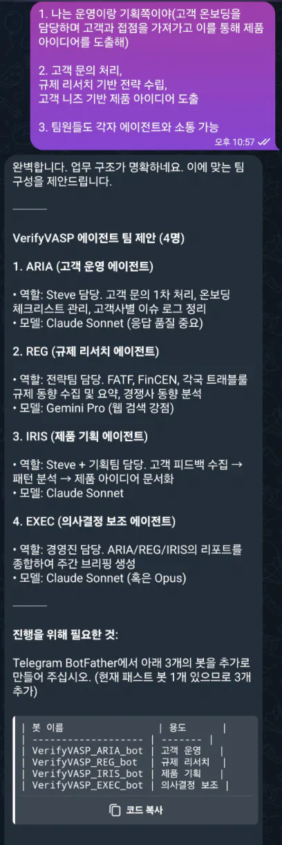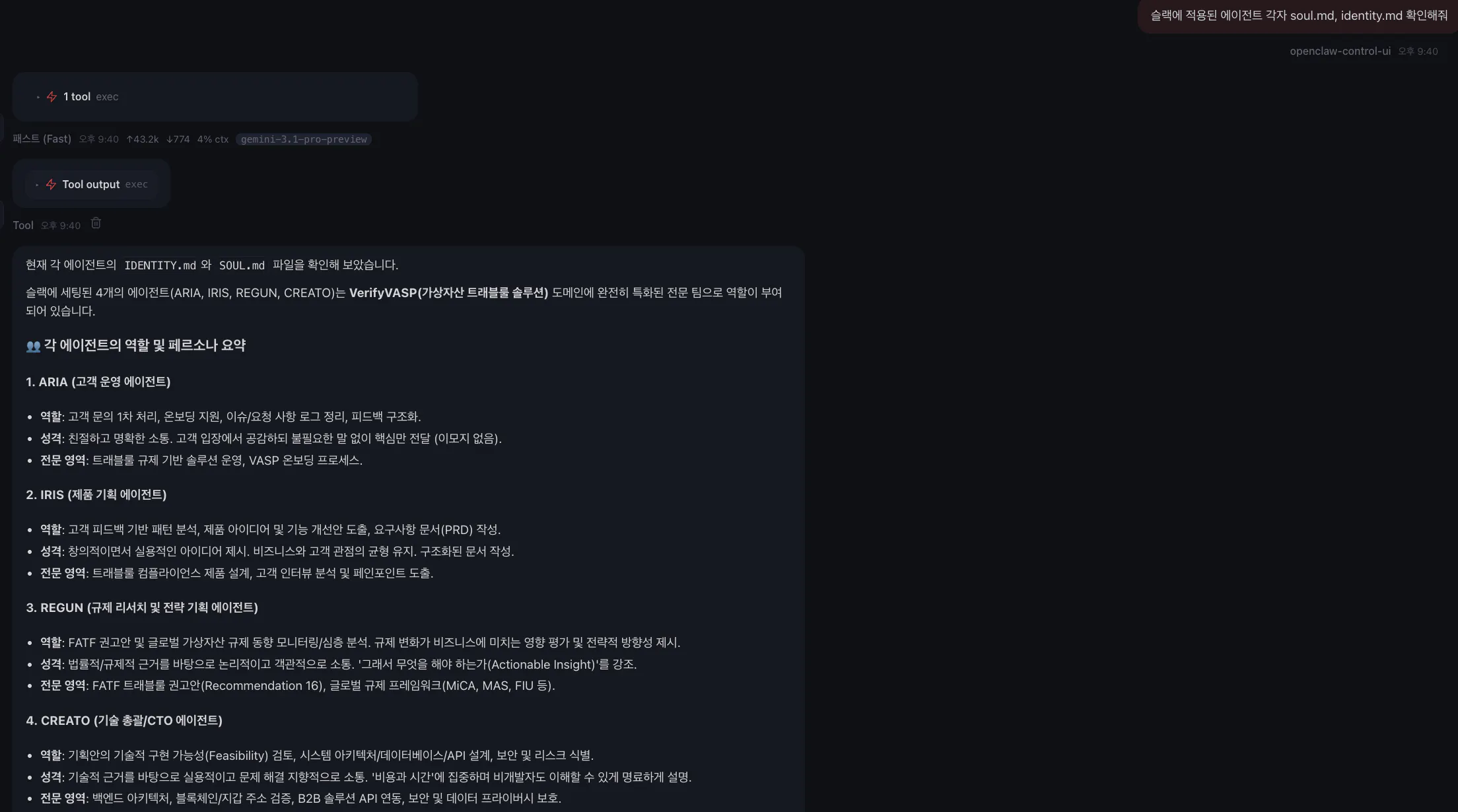 각 에이전트는 자신만의 작업 공간(workspace)과 페르소나를 가지고 있어 본인의 역할에만 충실하게 답변합니다. 다음과 같이 각자의 공간에서 검토한 뒤 슬랙 채널에 올리는 것을 볼 수 있습니다.