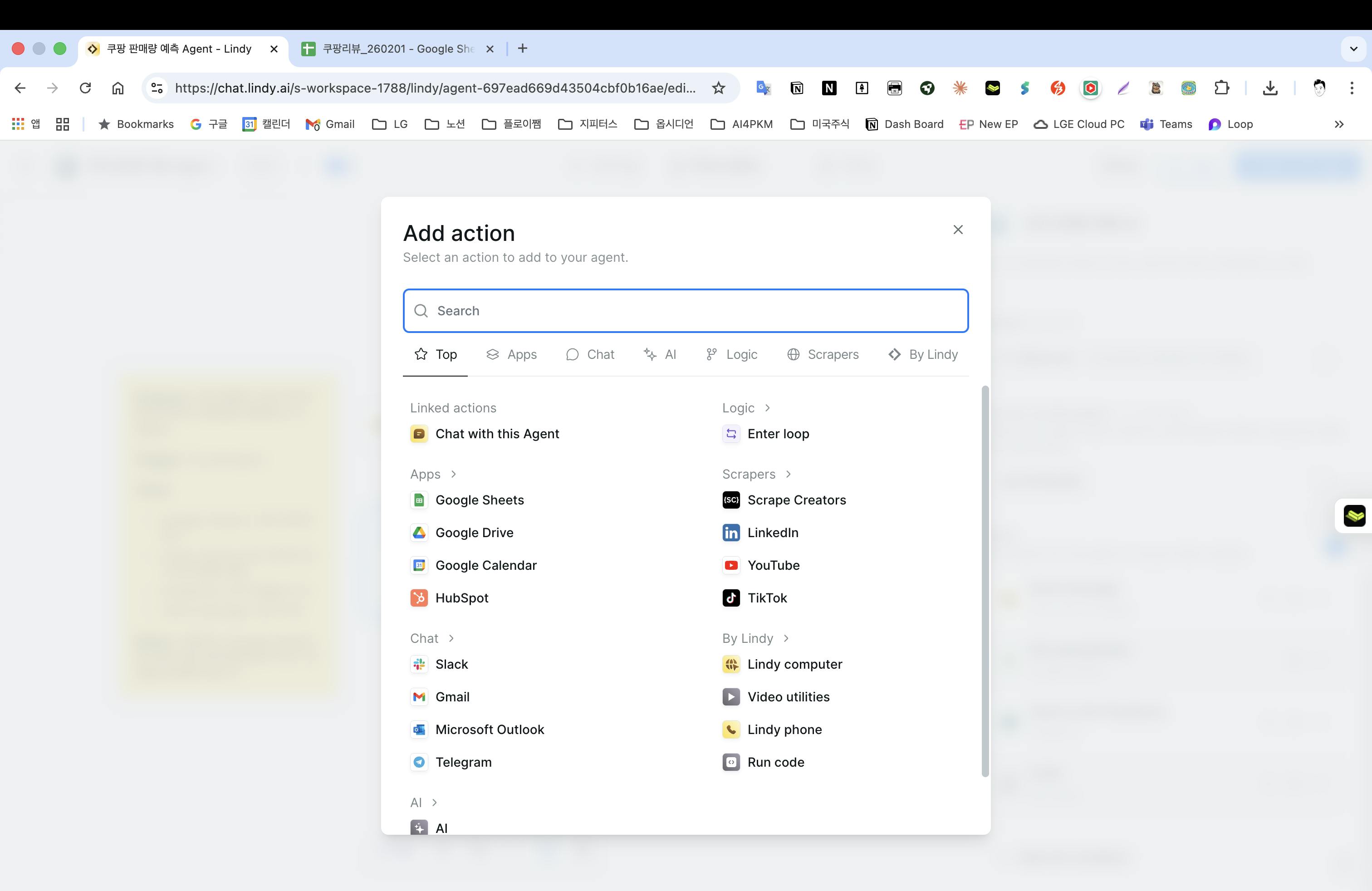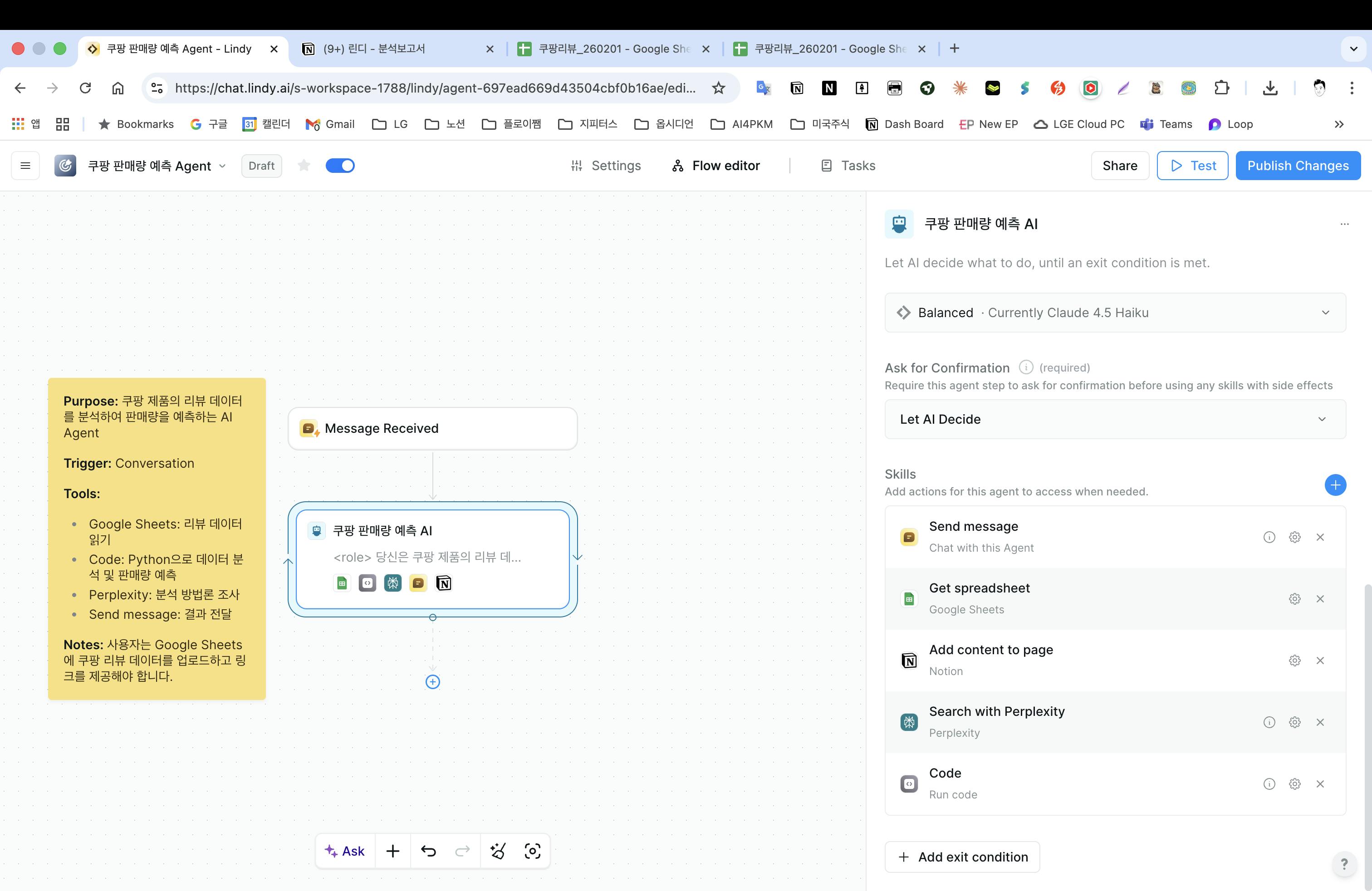 이번 프로젝트는 린디 에이전트를 통해 퍼플렉시티 기반의 Agent 설계 도구를 활용해 진행했어요. 전체적인 흐름은 다음과 같았습니다: