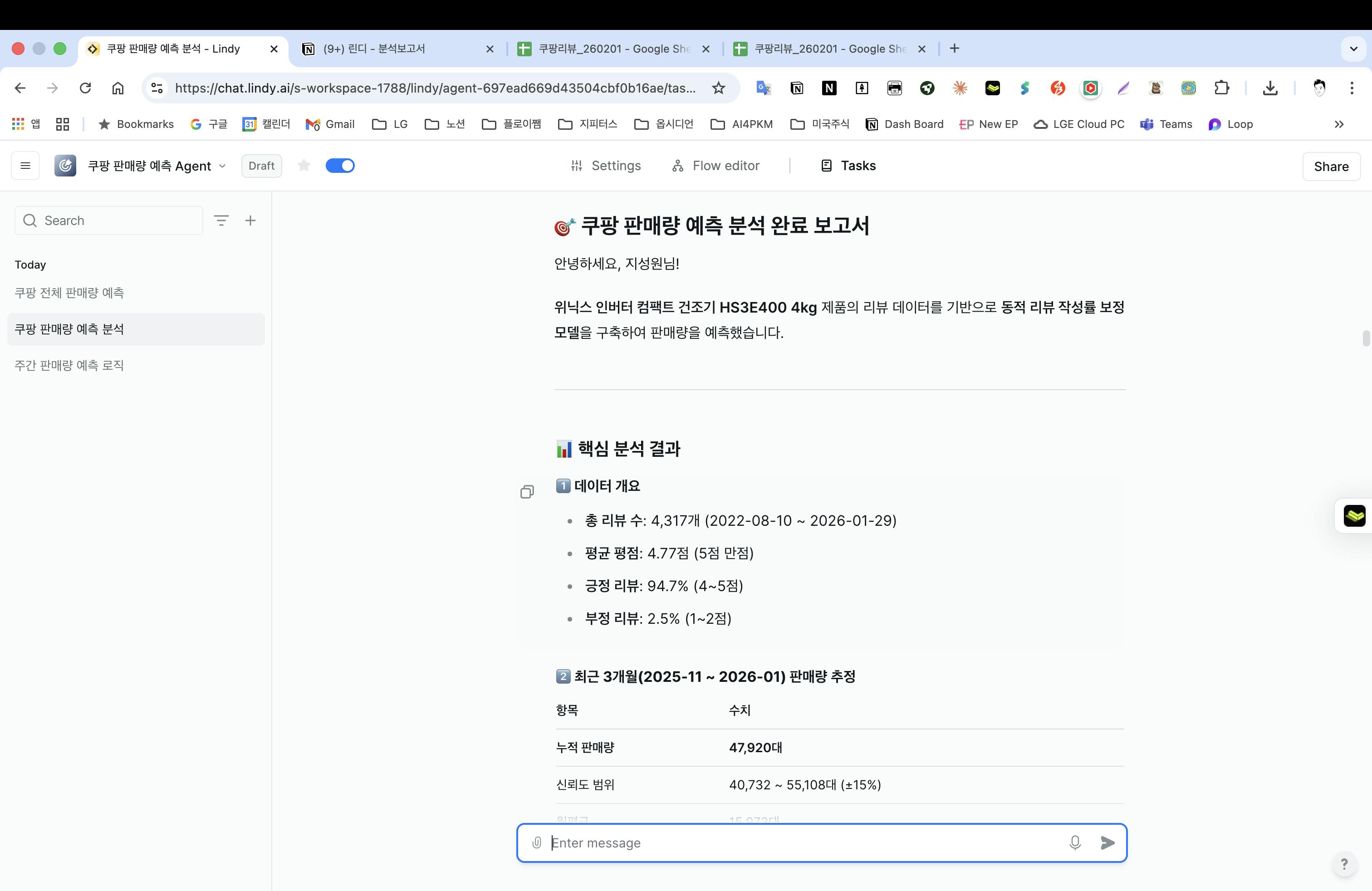 요즘은 쇼핑몰에 올라오는 리뷰만 봐도 그 상품의 인기나 판매량을 어림짐작할 수 있죠. 이걸 조금 더 진지하게, 데이터 기반으로 모델링 해보면 어떨까? 라는 생각이 들었습니다. 마침 쿠팡 리뷰 데이터를 CSV로 받을 수 있는 기회가 있어, 이 데이터를 바탕으로 리뷰 수만으로 판매량을 예측할 수 있는 Agent를 만들어 보기로 했습니다.