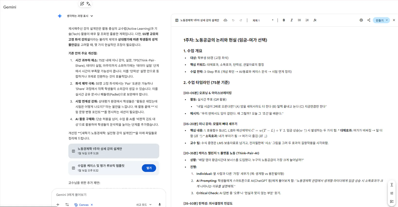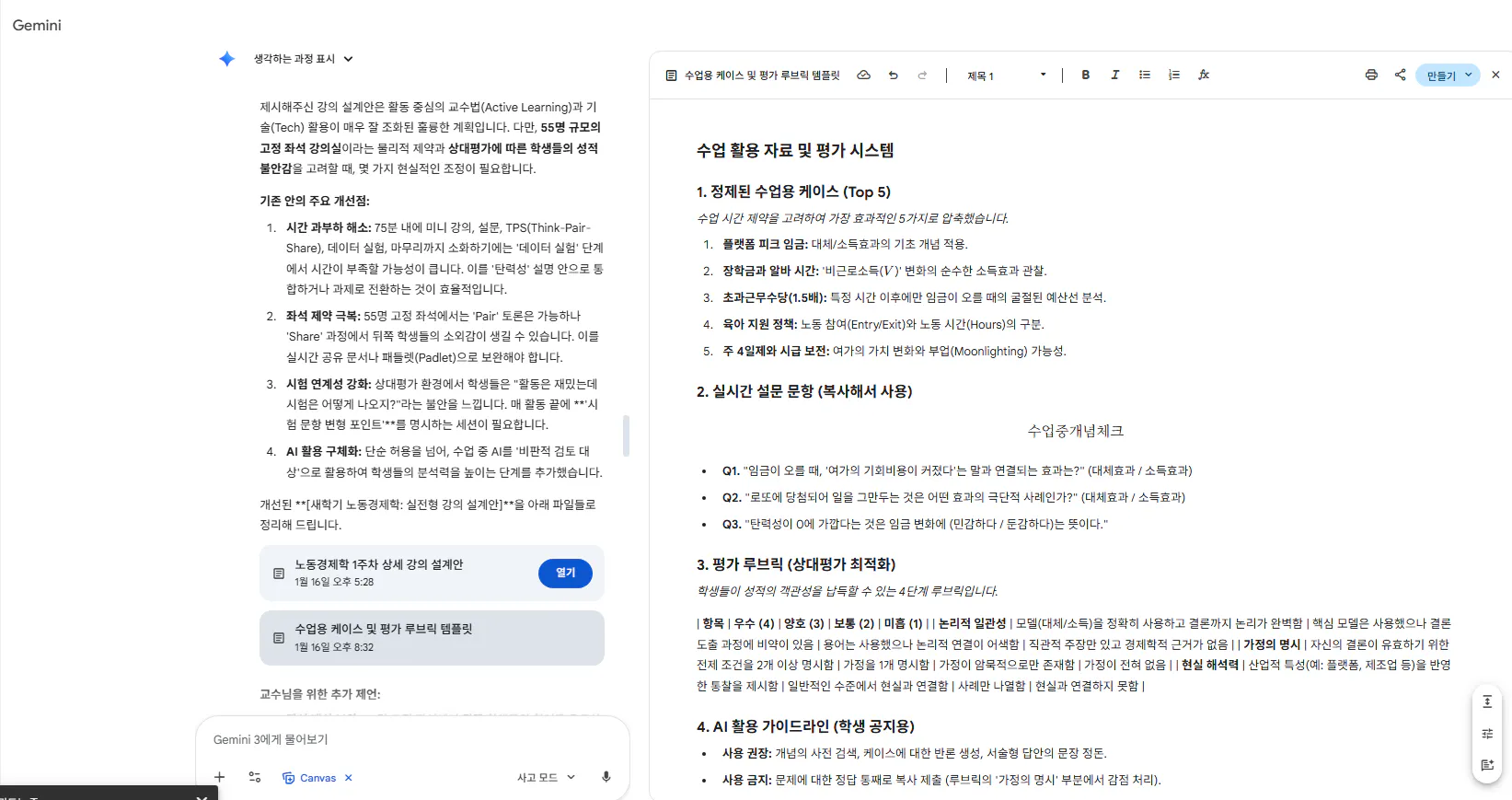 먼저 ChatGPT를 활용하여 강의에 참여하는 학생수와 강의실에 준비된 기자재의 수준과 강의실의 형태, 강의에 참여하는 학생들의 수준과 편차등을 반영하여 나에게 적합한 강의방식을 도출하고 이를 Gemini Canvas에 입력하여 문제점과 개선책을 더해 수업용 케이스 및 평가 루브릭 템플릿을 만들고 1주차 강의요약 인포그래픽을 만들고, 플래시카드와 퀴즈까지도 만든 다음 구글슬라이드까지 만들어 허접하지만 새학기 강의준비가 완료되었습니다.