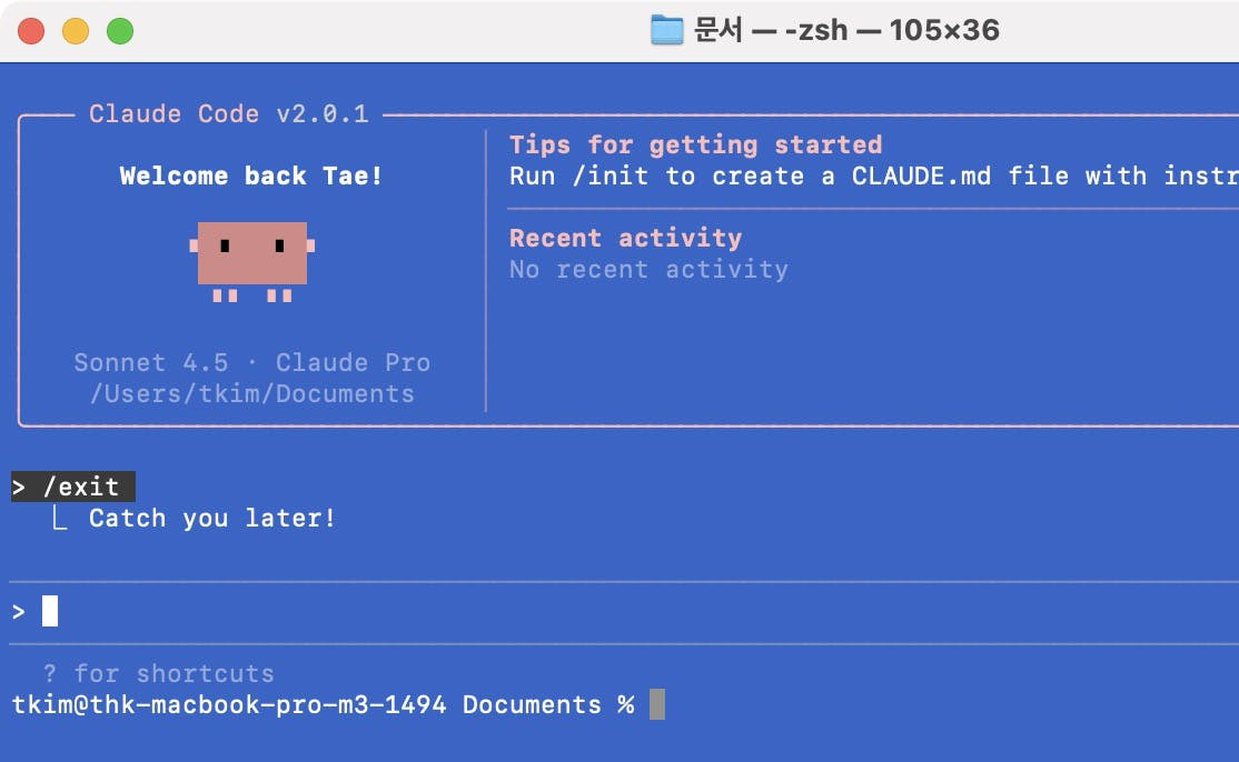 6. /exit 명령어 사용해서 클로드 코드에서 빠져 나와서 터미널로 이동