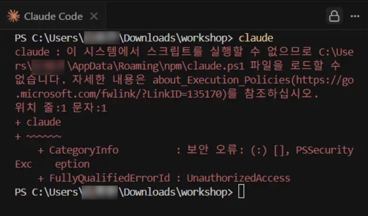 • 윈도에서 커서 내에 클로드 코드 실행 시 “Execution Error” 날때