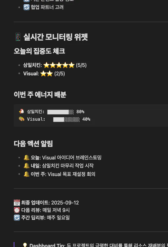 Obsidian MCP 연결을 완료한 기념으로, 테스트용 데일리 노트들을 종합해서 전체 프로젝트 진행 상황을 한눈에 볼 수 있는 대시보드를 만들어봤습니다.