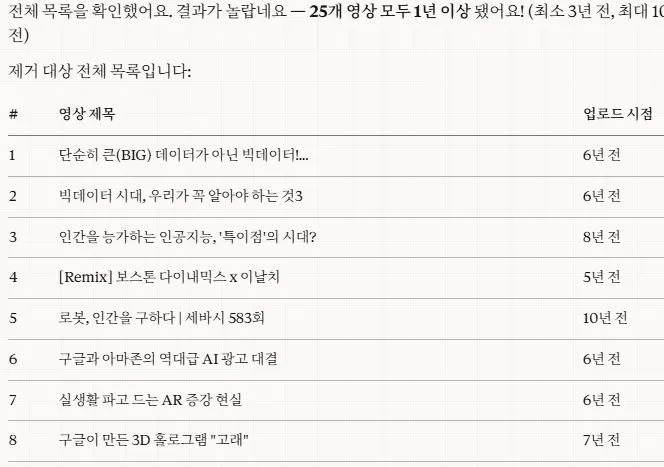 유튜브 재생목록에서 내용 보려다 너무 오래된 영상을 발견하고 수동으로 하나씩 지웠습니다.