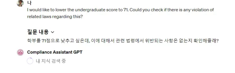 여러 질문을 하고, 관련 법령에서 확인해달라고 하면 “내 지식 검색 중”이라고 뜨면서 제가 올렸던 PDF에서 정보를 검색해서 답변을 줍니다.