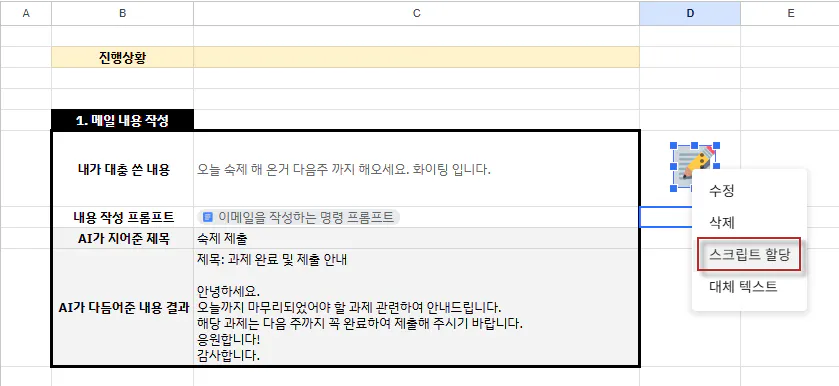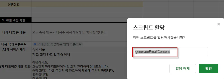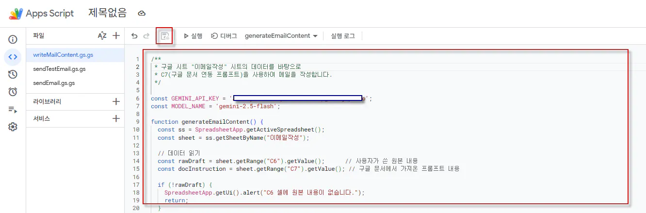 • Gemini가 생성한 Apps Script 복사 & 붙여 넣기 > 저장