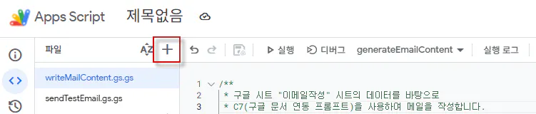 • "+" 클릭 후 writeMailContent.gs 이름 수정