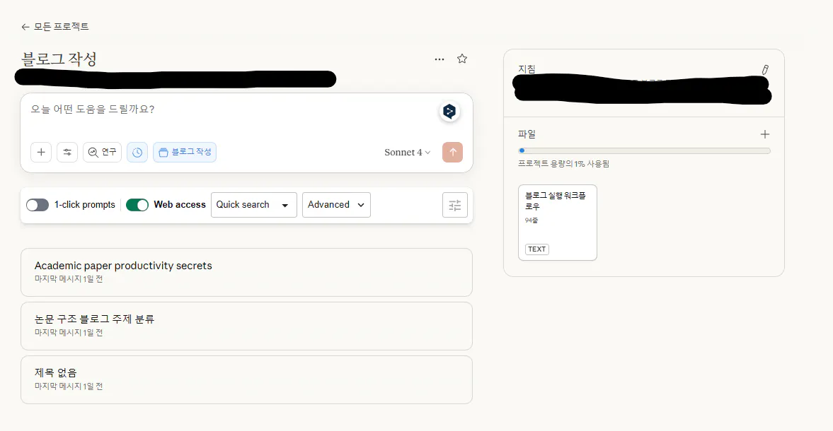 클로드 프로젝트에 블로그 작성 프로젝트를 생성하고 지침에 블로그 생성 프롬프트를 넣어둠. 제목을 미리 뽑아두고 매일 주제만 골라서 블로그 작성 중.