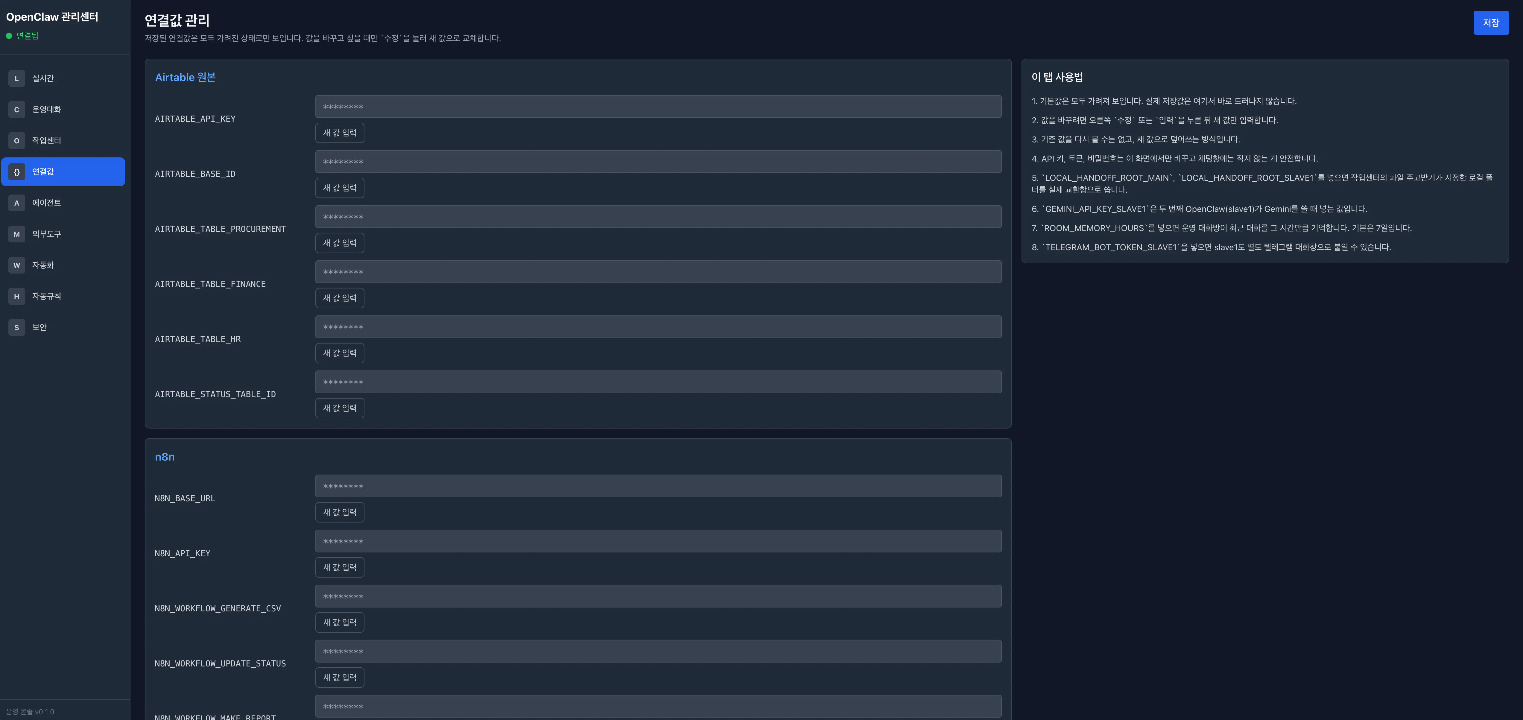 그래서 연결값 탭에서는 Airtable, n8n, Google Drive, Gemini, Telegram 관련 값을 한 화면에서 보이게 하고, 화면에는 마스킹된 값만 보이도록 구성함.