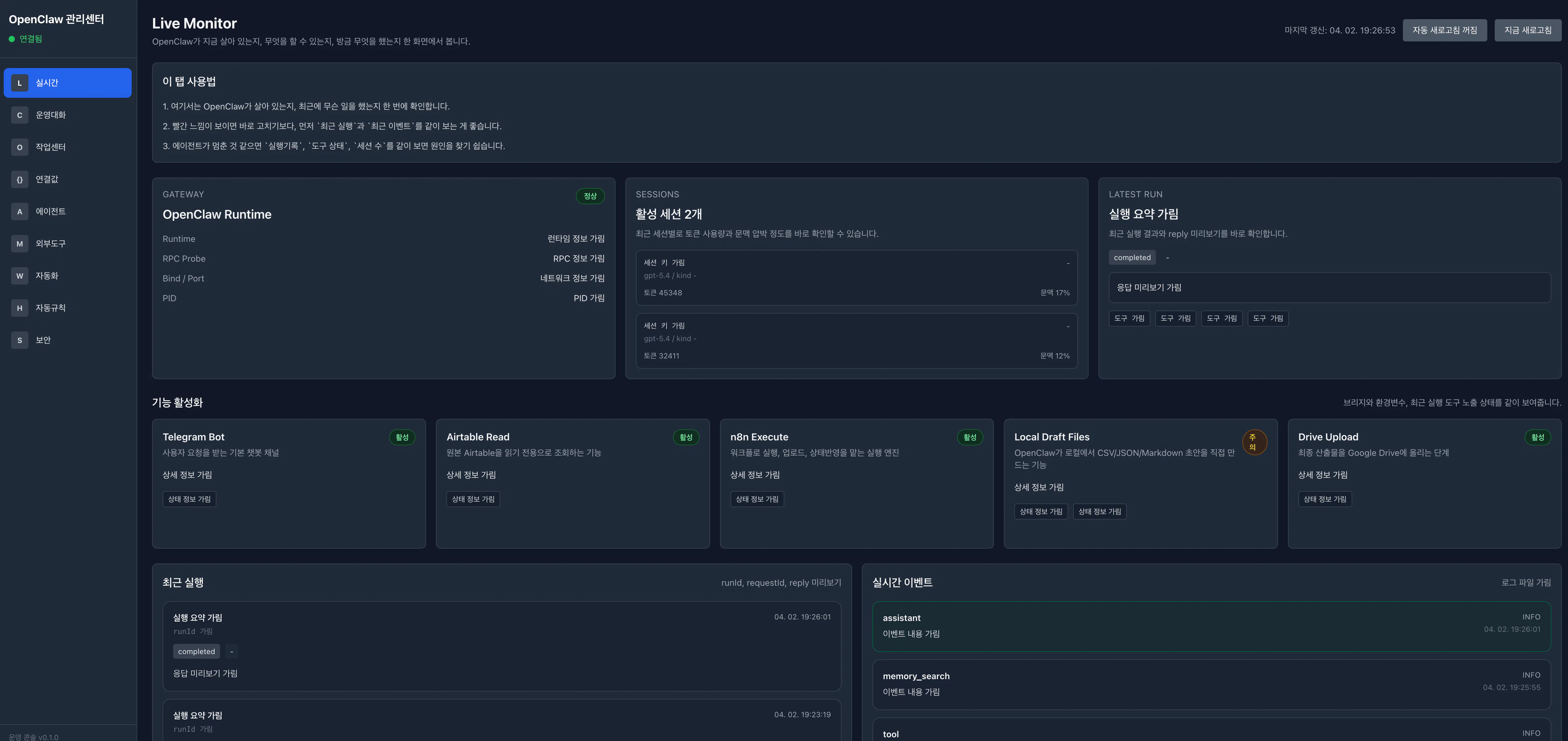 실시간: OpenClaw runtime, 최근 실행, 최근 이벤트, 활성 기능 상태를 보는 화면