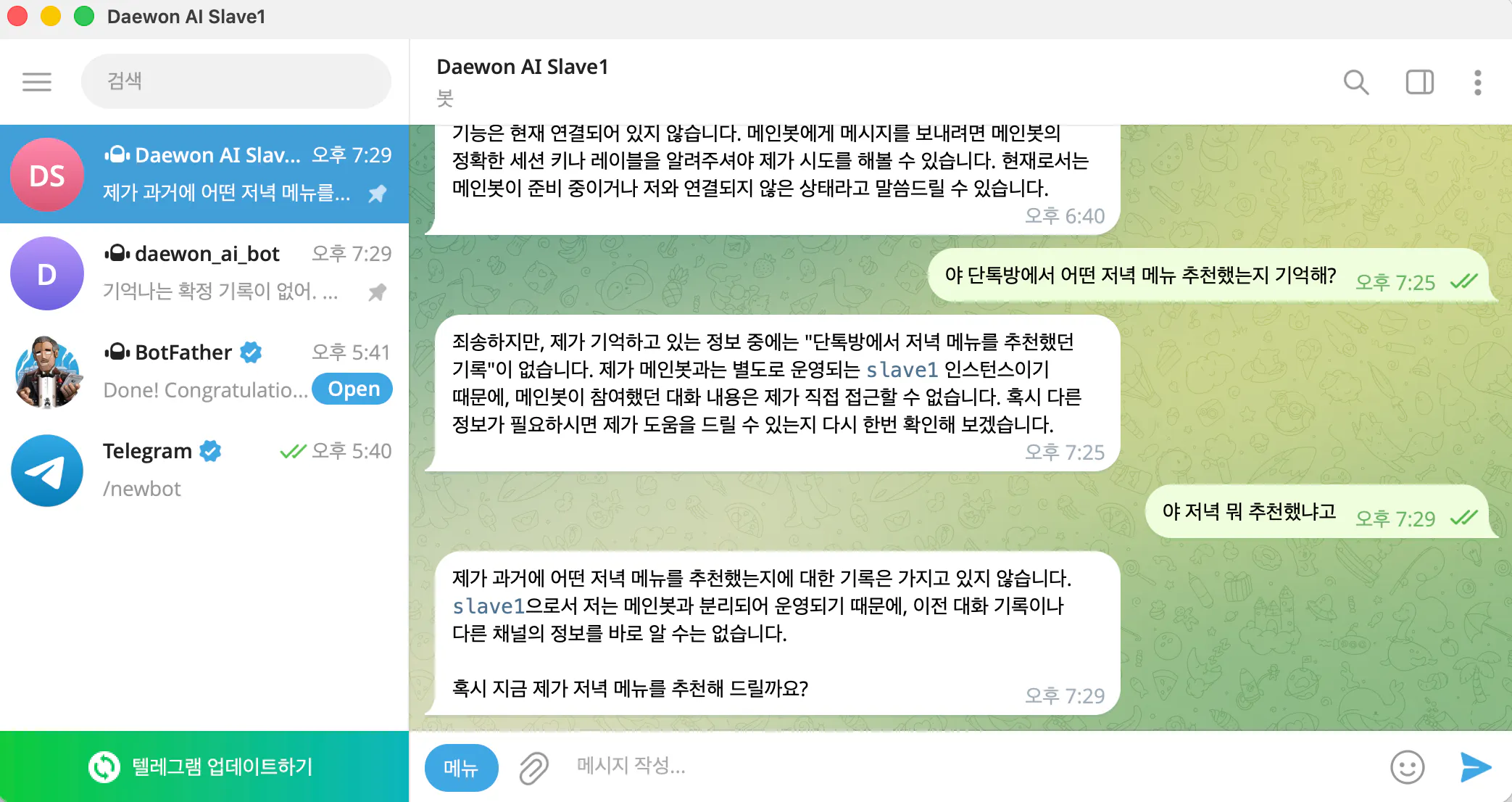 운영대화 기록을 main, slave1이 더 자연스럽게 공유해서, “아까 단톡방에서 뭐라고 했더라?” 같은 질문에도 기억을 이어받아 답하도록 개선할 예정임.