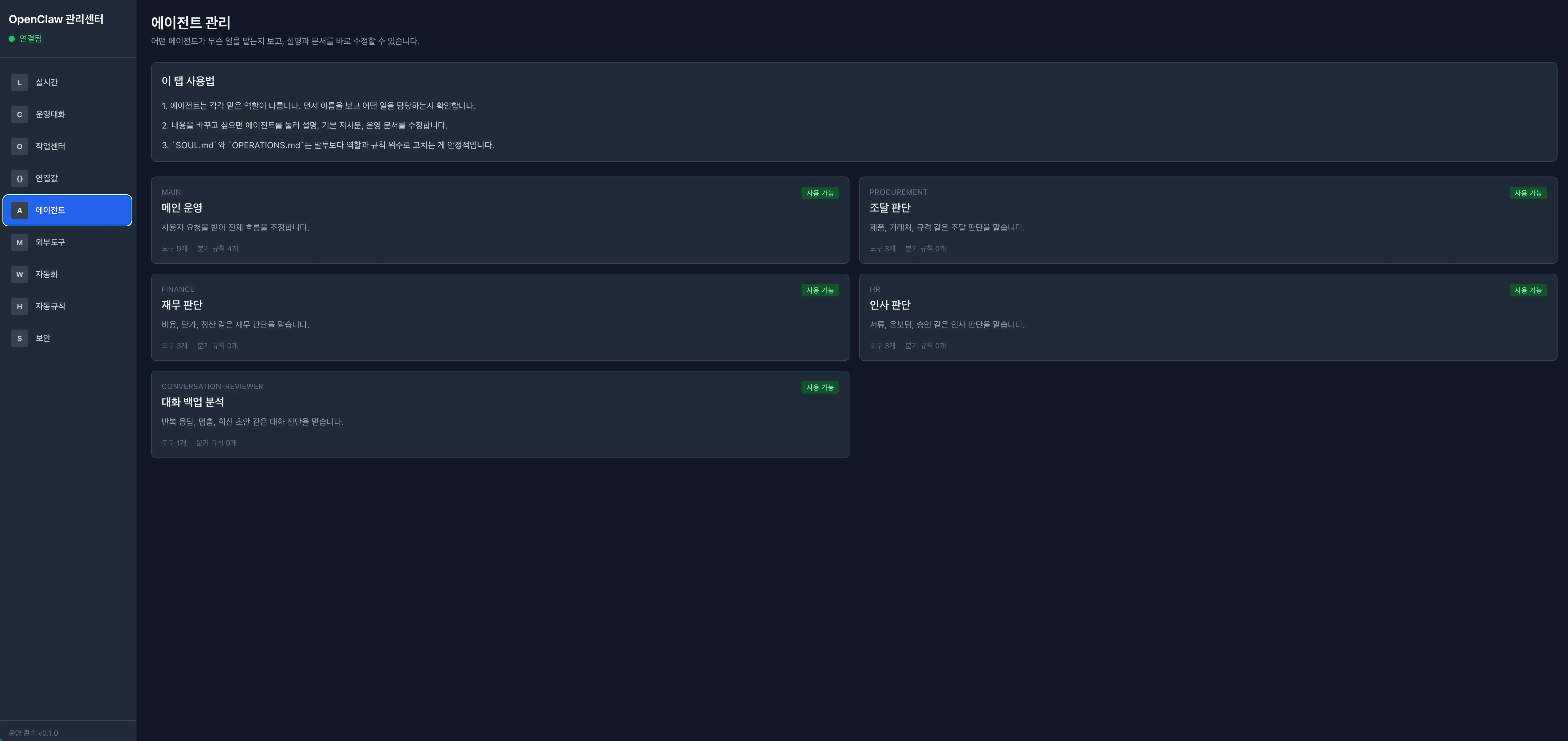 에이전트 탭에서는 main, procurement, finance, hr, conversation-reviewer 같은 에이전트를 카드형으로 보여주고, 들어가서 설명/기본 지시문/운영 문서를 수정할 수 있게 함.