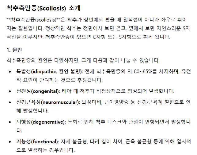 ChatGPT에게 먼저 척추측만즈에 대해서 질문을 던져주었습니다. 아래와 같은 설명을 해주어서 대충 어떤 질병인지 파악해보았습니다.