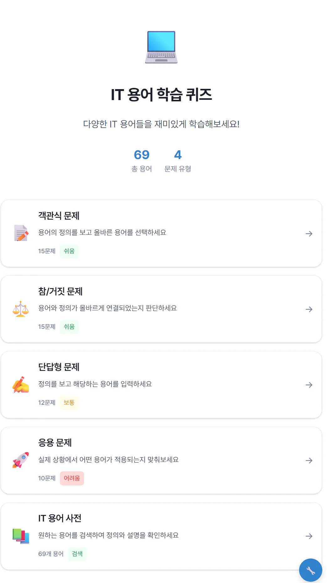 - **문제 풀 확장**: 새 용어 추가 시 자동으로 문제 풀 증가