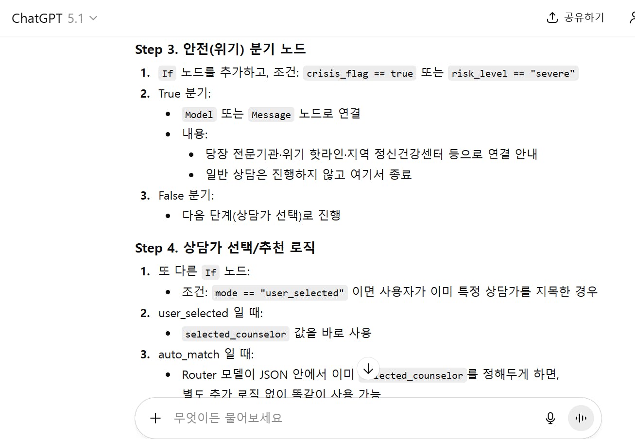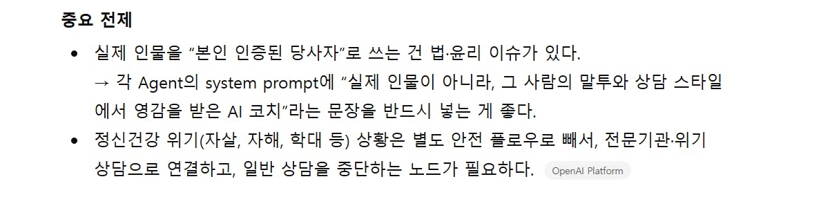 Crisis 대응 Agent는 절대로 구체적인 치료법이나 방법을 제시하지 않는다.라고 설정을 했습니다.