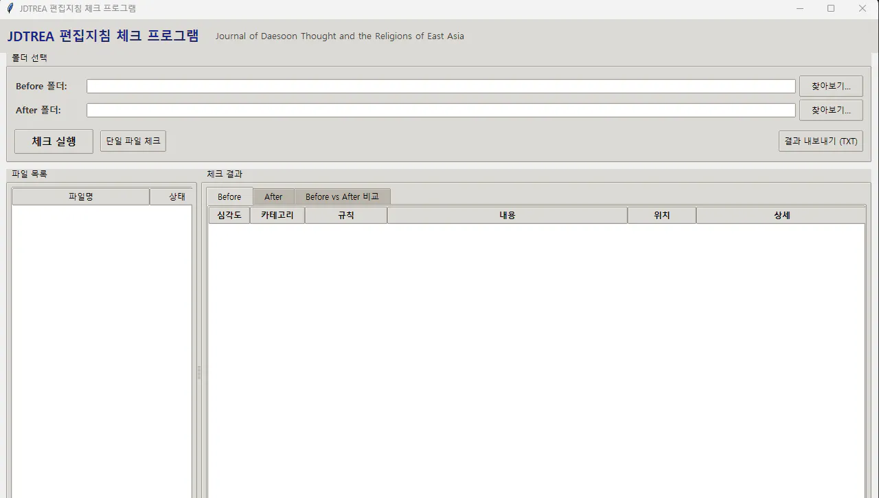 편집지침에 따라 논문집이 잘 편집되었는지 체크하는 프로그램을 만들어야돼. VBA가 좋을지 파이썬이 좋을지 추천해서 만들어줘. 각 파일은 아래와 같아. before 폴더와 after폴더가 나오게 gui로 만들어줘.수정 위치에 해당 문단 앞 40자 미리보기로 충분히 써서 ctrl+f로 찾게 해줘.직선 홑따옴표, 직선 어포스트로피 교정시 폰트가 apple garamond 면 제외해줘.편집지침도 기존에 있는것이 너무 복잡해서 정리해달라고 함.